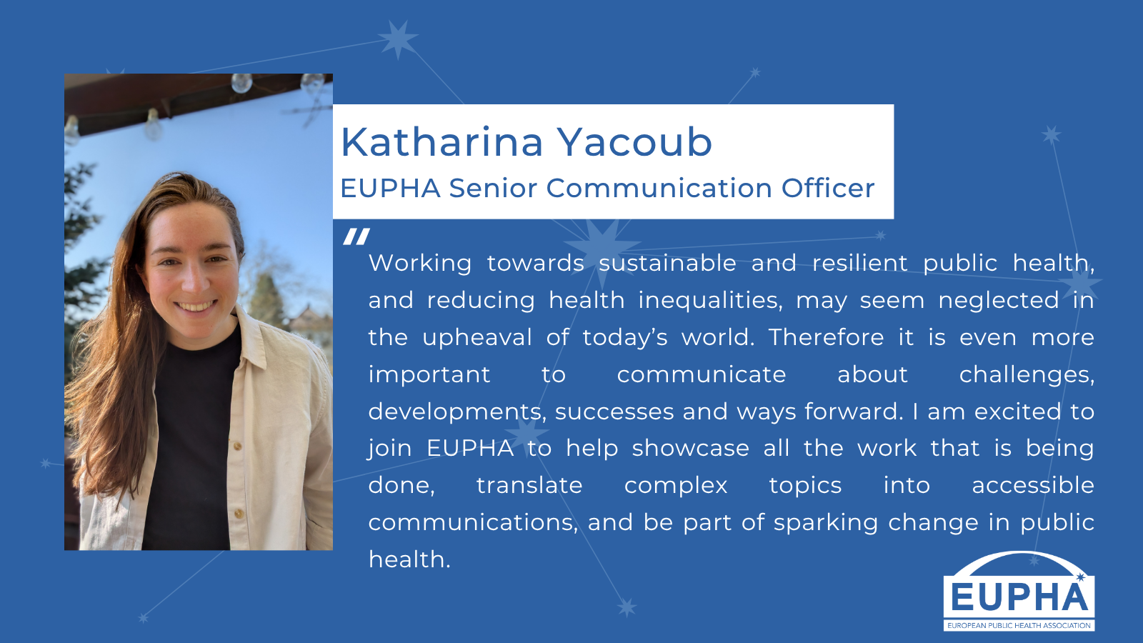 We are delighted to welcome Katharina Yacoub as our new Senior Communications Officer at EUPHA! Upcoming EUPHA Section webinarsOur Sections continue to bring together experts from across Europe and beyond to explore today’s most pressing public health challenges. Join us to stay informed, share knowledge, and connect with the latest research and policy developments.